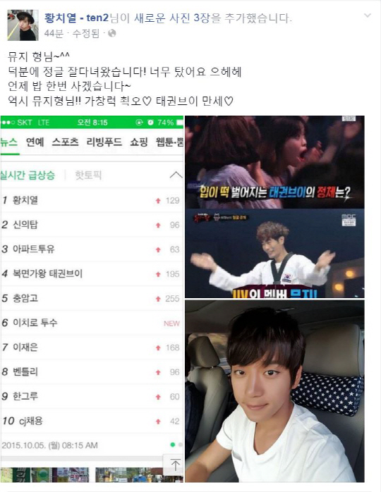 황치열이 포털사이트 검색어 1위에 오른 캡쳐 장면과 '복면가왕' 태권브이의 정체가 뮤지임이 공개된 방송캡처 사진을 공개했다. 이와 함께 또렷한 이목구비에 여심을 사로잡는 훈훈한 외모가 돋보이는 셀카를 함께 공개해 눈길을 끈다.