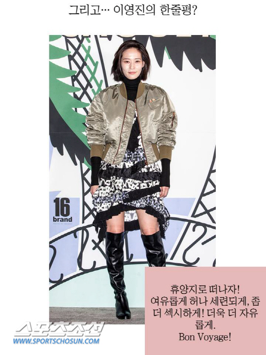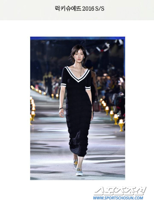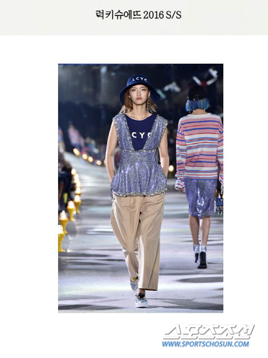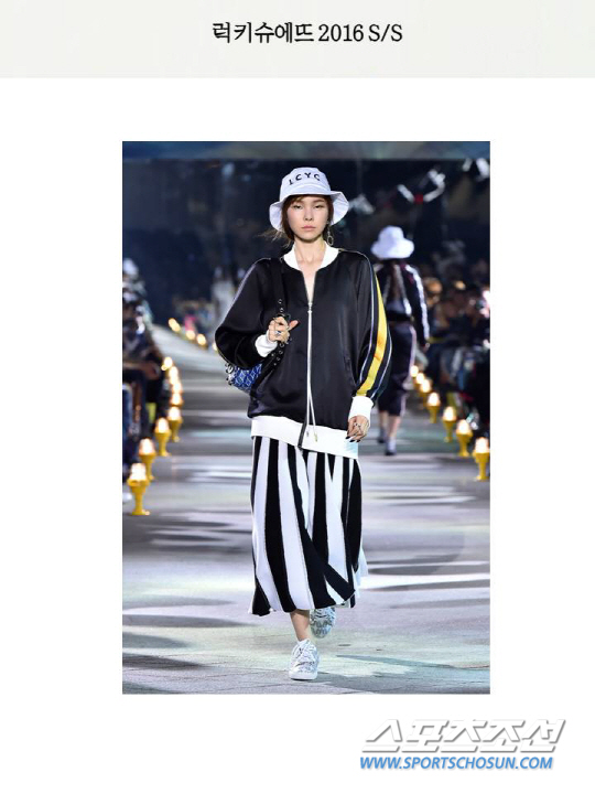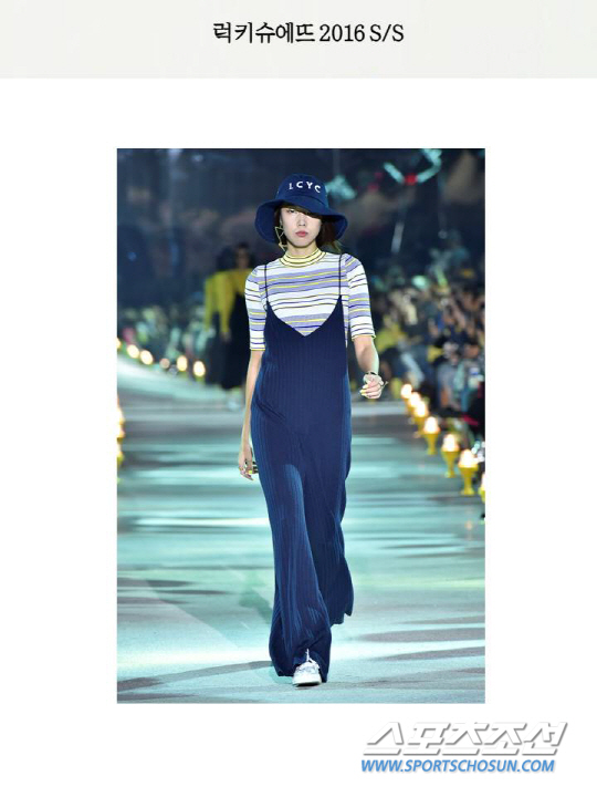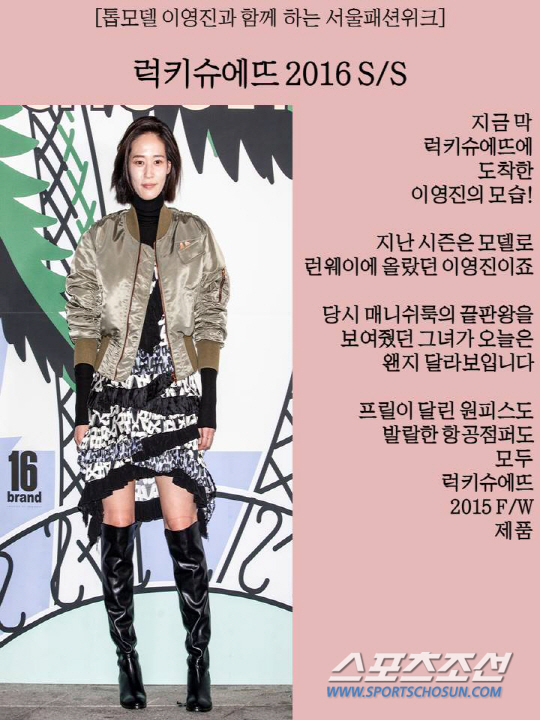 17일 오후 8시 DDP의 미래로 브릿지에 조명이 설치됩니다. 럭키슈에뜨에게 DDP 내부는 좁았나봅니다. 동대문 전역이 훤히 보이는 미래로브릿지에서 2016 S/S 런웨이를 열게 되었습니다. 외부에 설치된 포토월에 지나가던 시민들이 시선을 빼앗겼습니다. 순식간에 인파가 몰려들어 직원들도 우왕좌왕, 그야말로 정신없는 상황이 연출됐죠. 그런 상황 속에서도 셀러브리티들은 어쩌면 저렇게 꼿꼿한지요? 이영진 역시 누구보다 당당하게 포토월 입성! 예상치 못한 걸리쉬 스타일링에 깜짝 놀랐습니다. 여성스러운 프릴리 달린 원피스에 발랄한 크롭 항공점퍼! 지난 시즌 매니쉬룩으로 런웨이에 섰던 그녀는 어디갔나요?
