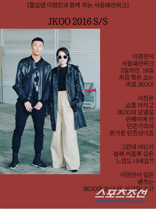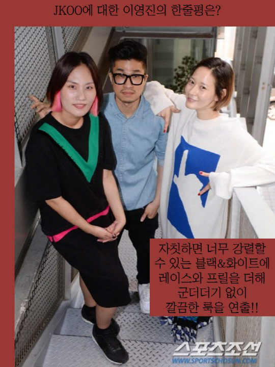 이날 이영진이 입은 신상 팬츠의 비밀 알려드릴까요? 바로 남성복이라는 사실! 남성복을 은근 섹시하게 소화한 스타일링 팁에 대해 서가영 스타일리스트가 입을 열었습니다! 바로 배가 살짝 보일 듯 말듯한 크롭트 블랙 니트를 함께 코디한 것이죠~. 팬츠 외에 선글라스와 오버사이즈 코트, 그리고 블랙니트 모두 JKOO 제품입니다. 사실 한 브랜드로 머리끝부터 발끝까지 스타일리쉬하게 코디하기란 어려운 일인데 역시 모델은 다르네요.
