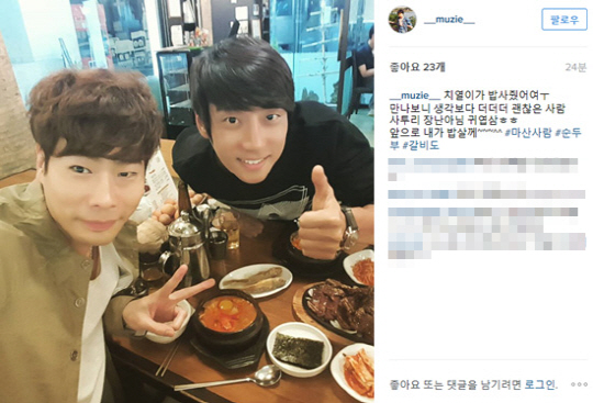 뮤지는 20일 자신의 인스타그램에 "치열이가 밥 사줬어요. 만나보니 생각보다 더더더 괜찮은 사람. 사투리 장난 아님 귀엽삼. 앞으로 내가 밥 살게"라는 글과 함께 한 장의 사진을 공개했다.