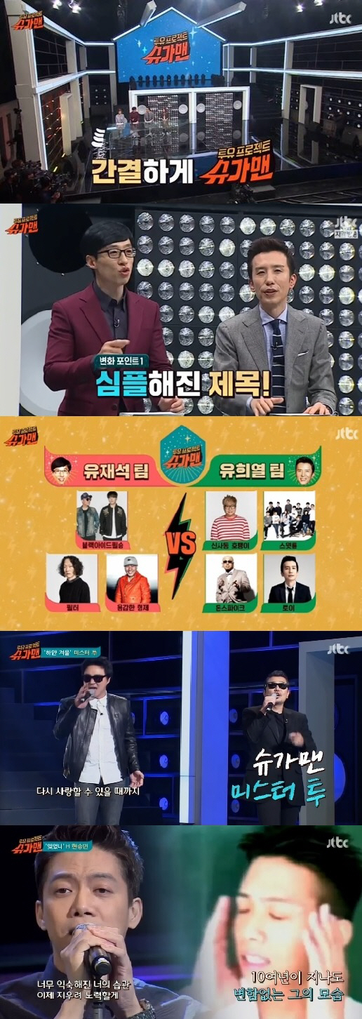 한편, '슈가맨'은 대한민국 가요계의 한 시대를 풍미했다가 사라진 가수, 일명 '슈가맨 (SUGAR MAN)'을 찾는 프로그램. 유재석과 유희열은 각각의 팀을 구성해 '슈가맨'을 찾게 된다. 이후 그들의 전성기와 히트곡, 가요계에서 사라진 이유와 그 이후의 행방 등을 알아보는 것은 물론 슈가맨의 히트곡을 2015년 버전으로 재탄생 시킨 역주행 송으로 승부를 겨룬다.