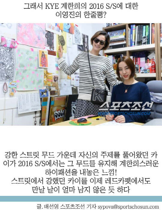 시크한 모델 이영진의 등장입니다. 이제 막바지에 접어든 2016 S/S 헤라서울패션위크. 하루 만을 앞두고 있는 지난 20일 오후 KYE의 쇼를 보기 위해 이영진이 출석했습니다. 이날 이영진은 스카이블루 컬러의 호박 팬츠를 입었습니다. 서가영 스타일리스트는 "이날은 머리부터 발끝까지 올 시크룩 이지만, 포인트인 팬츠의 호박 모양 밑단과 (가벼운) 컬러가 시크한 면을 덜어내고 있다. 또 바지 컬러와 톤온톤으로 맞춰 프레임이 블루로 된 빅 선글라스를 꼈다"고 말합니다. 롱 재킷에 하이웨이스트 팬츠를 입어 안그래도 큰 키가 더 커보이는 효과도 있었답니다. 이날 입은 코트와 팬츠는 KYE의 2015 FW 제품입니다.