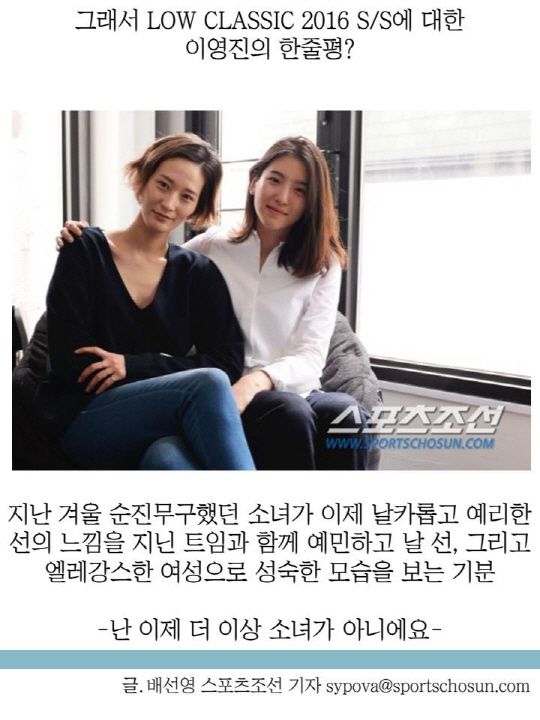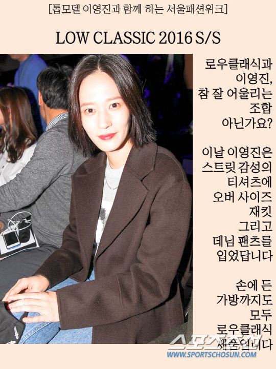 20일 오후 로우클래식의 2016 S/S 쇼가 열려습니다 이날 이영진이 선택한 룩의 컨셉은 보이프렌드. 마치 남자 아이들이 입을 법한 캐릭터가 그려진 기본 티셔츠에 오버 사이즈 롱 코트를 걸쳤네요. 여기에 데님까지! 하지만 앵클부츠와 손에 든 체인 백 덕분에 적당히 근사하게 차려입은 느낌도 나죠. 서가영 스타일리스트는 이영진의 이번 컬렉션 룩 중 가장 마음에 드는 룩이었다며, 특히 데님 팬츠는 본인도 사버렸다고 말합니다. 만약 여기에서 더 캐쥬얼한 느낌을 주고 싶다면 운동화를 신고, 포멀한 느낌을 더하고 싶다면 이영진처럼 구두를 신으면 된다고 하네요. 또 페미닌한 느낌을 전하고 싶다면 스카프르 둘러도 조좋다고 하고요.