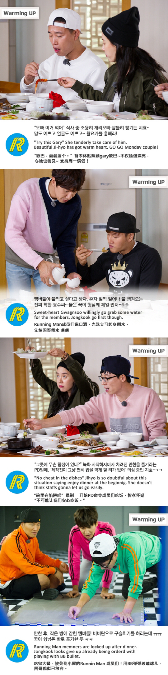 현장에 있던 런닝맨 관계자는 "오프닝 촬영 시간이 마침 점심시간이라 한정식을 차려놓고 미션 설명 전에 무작정 식사를 하라고 했는데, 일렬로 앉아 식사를 하다보니 식탁에 다양한 요리를 모두 즐기지 못하는 일이 생겼다. 이에 송지효가 옆에 앉은 개리가 이것저것 식사를 잘 할 수 있도록 손이 닿지 않는 요리와 반찬을 계속 집어주며 개리를 살뜰히 챙겼다"고 밝혔다.