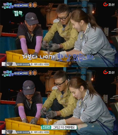 이후 진태현은 함께 한치를 잡으러 갔던 선장님에게 "(박시은이) 저보다 한 살 더 많다. 그리고 더 (연기자)선배다"고 밝혀 눈길을 끌었다. <스포츠조선닷컴>