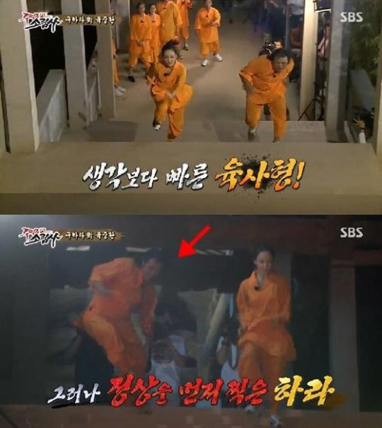 이후 육중완은 벌칙으로 구하라를 등에 올리고 팔굽혀펴기를 하며 모두에게 웃음을 선사했다. <스포츠조선닷컴>