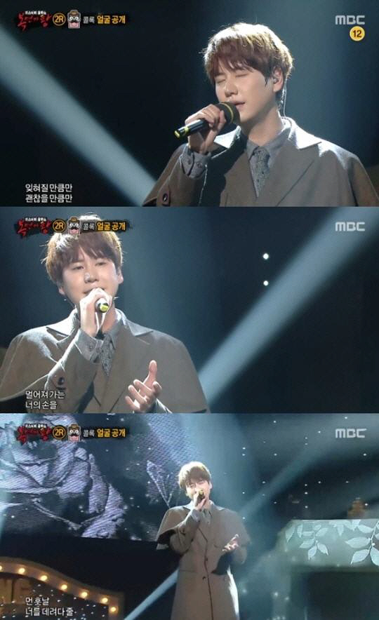 이날 '명탐정 콜록'은 2라운드 두 번째 대결에서 전람회의 '이방인'을 선곡해 열창했다. 애절한 감성이 돋보인 무대였지만 아쉽게도 '꼬마 마법사 아브라카다브라'에게 패했다.