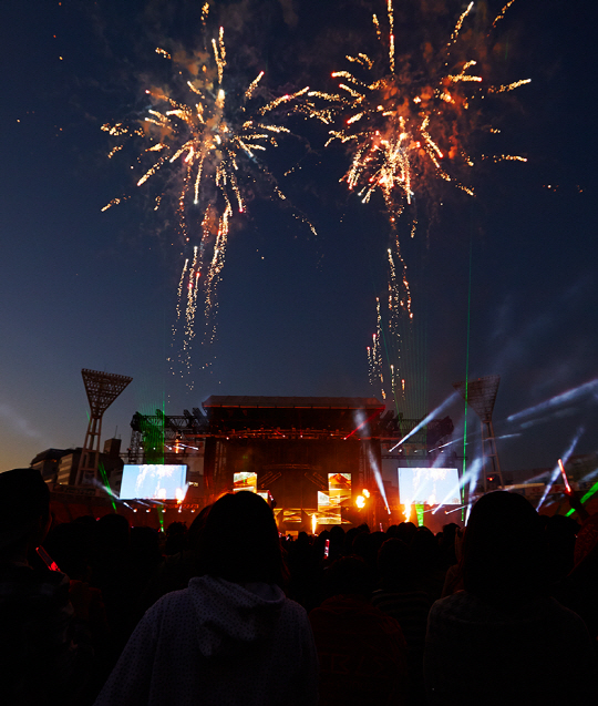 XIA준수의 4번째 아시아 투어 공연을 보기 위해 요코하마 스타디움을 가득 채운 팬들 위로 대형 폭죽 꽃이 피었다.