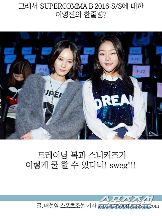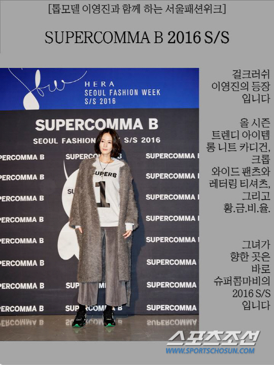 스포츠조선 패션자문단들과 패션 어플리케이션 셀럽스픽 유저들이 뽑은 베스트룩 3위에 선정된 이영진의 걸크러쉬룩. 박만현 스타일리스트는 그녀의 패션에 대해 "황금비율이 아니라면 감히 소화할 수 없는 아이템들을 그레이 컬러 무드로 개성있게 소화했다"라고 평가했는데요. 찬사를 받은 룩을 입고 그녀가 향한 곳은 바로 지난 20일 열린 서울패션위크의 슈퍼콤마비 2016 S/S 컬렉션입니다.