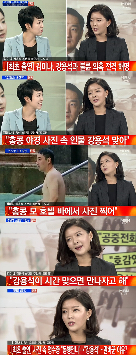 김미나는 28일 오후 4시 50분 방송하는 '뉴스&이슈'에 출연해 강용석과의 홍콩스캔들과 말을 바꾼 이유, 디스패치 카톡 편집에 대해 추가적인 주장을 펼쳤다. 간간히 미소나 웃음을 보이는 여유있는 모습의 해명이었다.
