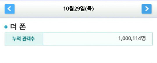 영진위통합전산망에 따르면 영화 '더 폰'은 개봉 8일째에 누적관객수 100만114명을 기록하며 100만 관객을 돌파했다. 특히 개봉 2주차에도 높은 좌석점유율을 기록하며 흥행 궤도를 달리고 있는 '더 폰'은 '마션'을 제치고 개봉주 박스오피스 1위을 차지했으며 한국 영화 중에서는 '사도' 이래 20여일 만의 첫 박스오피스 1위작 탄생을 알린 바 있다.