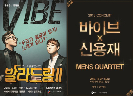한편, 2015 바이브 연말 콘서트 '발라드림 시즌2'는 오늘(29일) 오후 2시에, 2015 바이브X신용재 연말 콘서트 는 오후 3시에 티켓 오픈이 진행된다. 가격은 두 콘서트 모두 VIP석 132,000원, R석 121,000원, S석 110,000원, A석 99,000원(VAT포함)이며 티켓 예매는 인터파크 티켓(ticket.interpark.com)를 통해 가능하다.