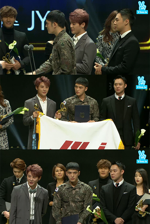 현재 군 복무 중인 김재중과 공익근무요원으로 대체 복무 중인 박유천은 문화관광부와 국방부, 병무청 간의 협의 끝에 이날 대중문화예술상에 참석했다.