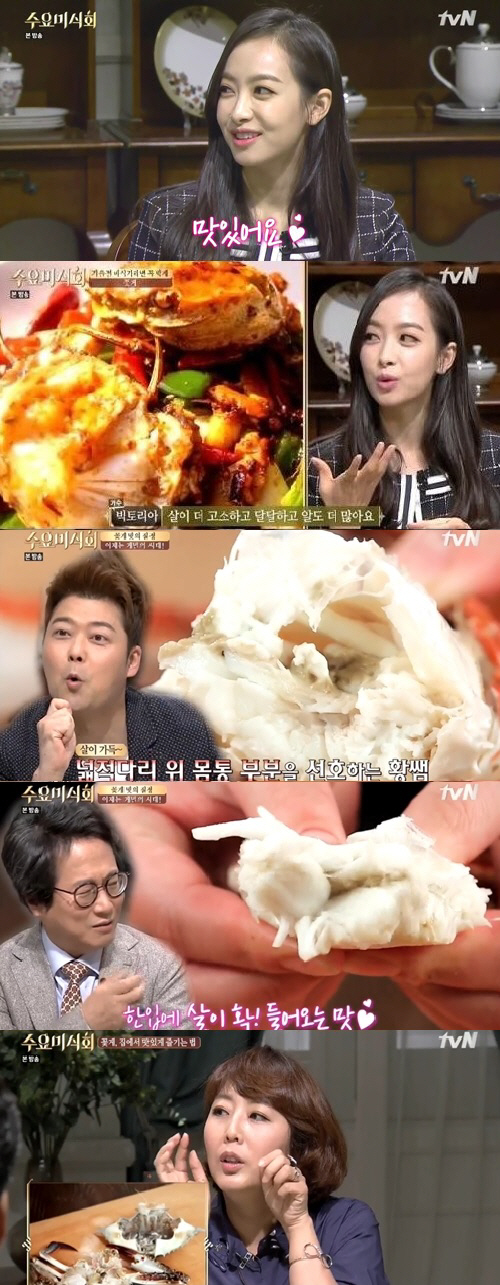 이날 빅토리아는 "중국 칭다오 꽃게가 한국 꽃게보다 크냐" MC 질문에 "작고 동그랗게 생겼다. 근데 살이 더 고소하고 달달하고 알도 더 많다"고 차이를 설명했고, "한국의 간장 게장을 먹어보니 신세계였다. 게딱지 내장에 밥을 비벼먹는 게 정말 맛있었다"며 입맛을 다셨다.