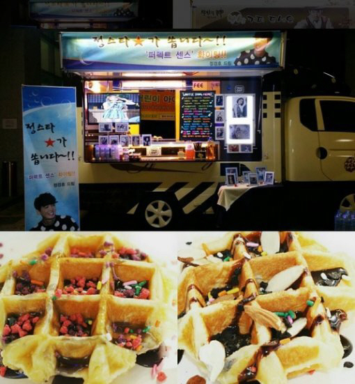 공개된 사진에는 수영의 촬영장에 도착한 간식차가 찍혀있고, 연인인 배우 정경호의 사진이 들어간 현수막에는 '정스타가 쏩니다'라는 문구가 새겨졌다.