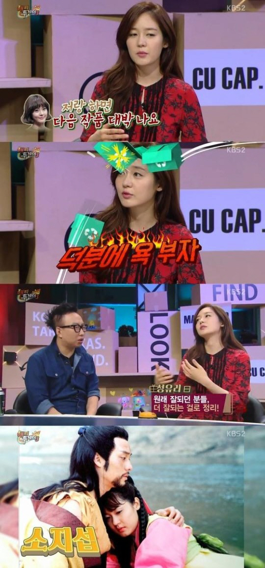 이날 MC 유재석이 "함께한 남자 배우들이 대박 난다던데?"라고 묻자 성유리는 "농담식으로 말한 것이다. 남자 배우들이 저랑 작품 하면 다음 작품 대박 난다는 인터뷰를 했다. 그런데 그 후로 욕을 많이 먹었다"고 답했다.