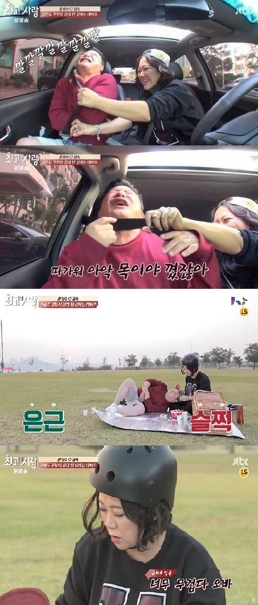 29일 방송된 JTBC '님과 함께2-최고의 사랑'에서는 윤정수, 김숙 커플이 한강 데이트를 즐기는 모습이 담겼다. 한강에 가기 위해 두 사람은 김숙의 차를 타고 이동했다. 윤정수가 조수석에 타자 운전석에 타고 있던 김숙은 몸을 숙여 윤정수의 안전벨트를 직접 채워주는 자상한 모습을 보였다.