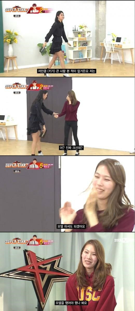 이날 강승현은 눈에 띄게 키가 큰 천단비 옆에 서서 "저만큼 키가 큰 여자를 본 적이 없는데 정말 크다"며 놀라워했다.