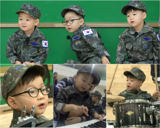 최근 진행된 KBS2 '해피선데이-슈퍼맨이 돌아왔다' 녹화는 '아이와의 줄다리기' 편으로 꾸며졌다. 공군에 입소한 삼둥이 대한 민국 만세는 군악대로 변신해 눈길을 끌었다. 에이스는 만세였다. 만세는 남다른 리듬감을 선보였다. 쿵쾅쿵쾅 드럼을 치더니 박자를 가지고 노는 여유까지 선보여 아빠 송일국을 깜짝 놀라게 했다. 이에 신이 난 만세는 드럼 스틱까지 고쳐 잡고 더욱 열정적으로 실력을 뽐냈다. 민국은 키보드를 잡았다. 장병 삼촌의 손을 잡고 건반을 치는 그의 모습에 군악대 삼촌들도 아빠미소를 지었다고. 대한은 차임벨을 맡았다. 대한은 처음 보는 차임벨이 신기한지 이리저리 만져봤고 혼자 연주법까지 습득했다. 차임벨을 마스터한 뒤에는 큰북까지 영역을 넓히며 꼬마 음악가의 면모를 과시했다. 방송은 1일 오후 4시 50분.
