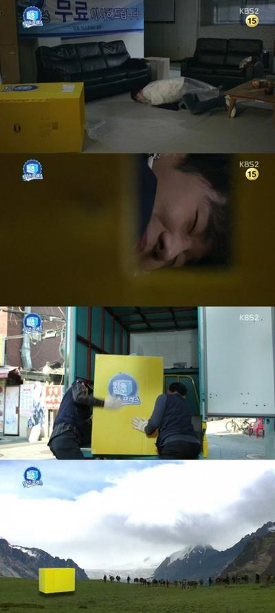 이날 방송에서 성규는 사무실에서 잠을 자던 중 추위를 느끼고 에어캡을 두른 채 이삿짐 상자에 들어갔다.