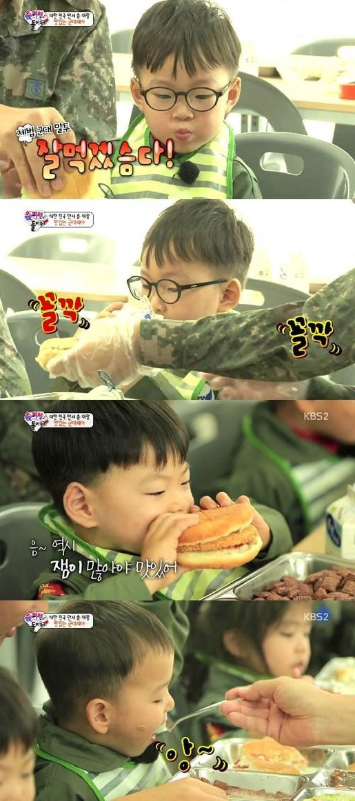 이날 공군 병영체험을 한 삼둥이는 아침 구보를 끝내고 급식소를 찾아 군대리아 시식에 나섰다.