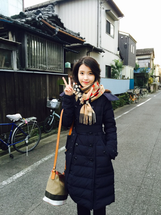 사진 속 아이유는 블랙 패딩을 내추럴하게 벨트를 묶어 연출해 가녀린 몸매가 돋보인다.