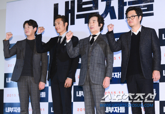 2일 오후 서울 동대문 메가박스에서 열렸다. 조승우, 이병헌, 백윤식, 우민호 감독(왼쪽부터)이 포즈를 취하고 있다. '내부자들'은 자신을 폐인으로 만든 일당에게 복수를 계획하는 정치깡패 안상구(이병헌), 비자금 파일과 안상구라는 존재를 이용해 성공을 노리는 검사 우장훈(조승우), 비자금 스캔들을 덮어야 하는 대통령 후보와 재벌, 뒷거래의 판을 짠 설계자 이강희(백윤식)가 벌이는 범죄극. 우민호 감독 작품으로 이병헌, 조승우, 백윤식, 이경영 등이 출연했다. 19일 개봉한다. 정재근 기자 cjg@sportschosun.com/2015.11.02/