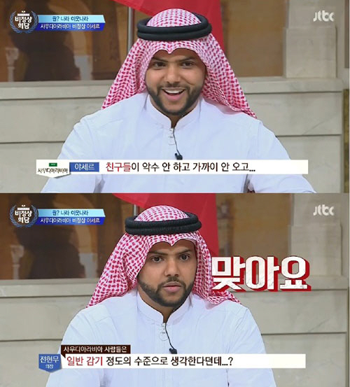 이날 방송에서 본격적인 토론에 앞서 '뭔나라 이웃나라' 코너에는 사우디아라비아 대표 야세르가 출연해 자국에 대해 소개하는 모습이 그려졌다.