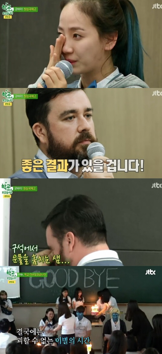 3일 방송된 JTBC '학교 다녀오겠습니다'에서는 청심국제고 편을 마지막 이야기가 담겼다. 이날 방송에서는 원더걸스 예은과 샘 해밍턴, 이준석, 후지이 미나, 혜이니, 강남이 정들었던 친구들과 이별을 하며 눈물을 흘렸다. 청심국제고와의 이별 뿐 아니라 지난 해 7월 12일 첫방송 이후 1년 4개월 만에 시청자를 떠나게 된 '학교 다녀오겠습니다'의 종영까지 더 해져 출연자들의 눈물이 더욱 보는 이의 마음을 아프게 했다.