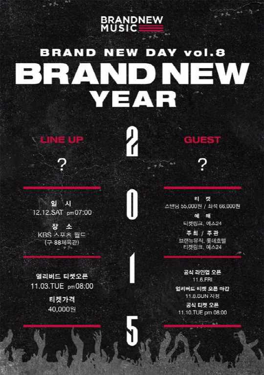 오는 12월 12일 토요일 저녁 7시에 KBS스포츠월드(구 88체육관)에서 열리는 '브랜뉴이어 2015'의 사전 할인 티켓 예매는 11월 8일 자정까지 진행되며 공식 티켓 오픈은 10일부터 티켓링크와 예스24를 통해 시작된다.
