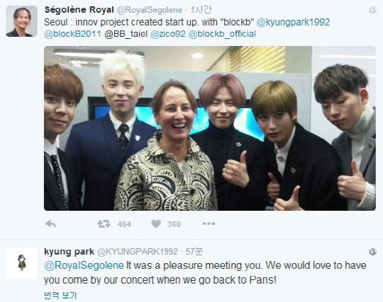 4일 오전, 한국과 프랑스의 수교 130주년을 기념해 올랑드 대통령과 함께 방한한 '세골렌 루아얄' 장관은 역삼동 D.CAMP에서 마련된 '한국 벤처기업과의 만남' 자리에서 K-POP 아티스트로 단독 참석한 '블락비'를 만났다.