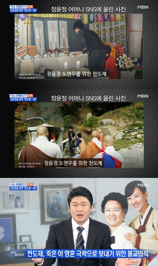 5일 오전 MBN '뉴스파이터'는 장윤정 어머니 육흥복 씨가 자신의 SNS에 장윤정을 위해 천도재를 지낸 사실을 보도했다.