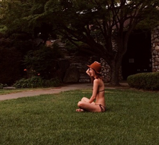 한채아는 자신의 SNS를 통해 비키니를 입은 채 풀밭 위에 앉아 있는 사진을 게재했다.