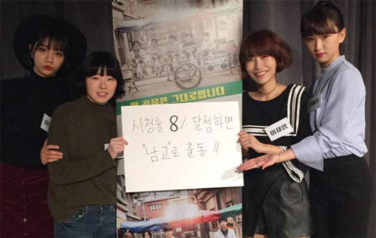 일단 시청률 8%를 달성하면 출연진이 '남고'로 출동한다. 해당 사진에는 류혜영, 이세영, 이혜리, 이민지가 공약이 적힌 종이를 들고 웃음을 짓고 있다.