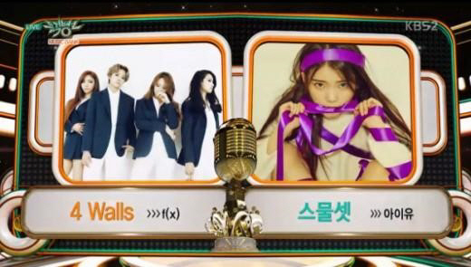 특히 에프엑스는 신곡 '포 월즈(4 Walls)'로 방송 출연 없이 1위 후보에 오른 아이유 '스물셋'과 1위 자리를 놓고 경쟁을 펼친다.