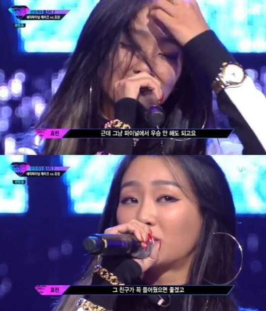 결국 이날 효린은 9표 차이로 헤이즈를 이겼다. 효린은 울먹이며 "제가 씨스타 1위 때도 운 적이 없다"면서 "파이널 때 안 이겨도 좋다. 누군가를 생각하면서 이 노래를 불렀다. 그 친구가 꼭 들어줬으면 좋겠다. 앞으로 여러분도 제 노래로 치유 받으셨으면 좋겠다"고 소감을 밝혔다. <스포츠조선닷컴>