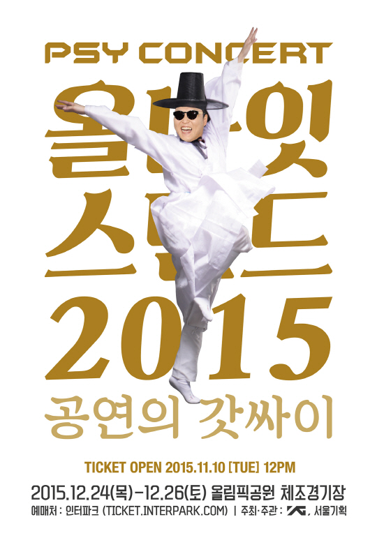 YG엔터테인먼트는 7일 오전 10시 공식블로그(www.yg-life.com)를 통해 싸이의 연말 콘서트 개최 사실을 알리는 포스터를 게재했다. 포스터에는 'PSY CONCERT 올나잇 스탠드 2015 -공연의 갓싸이'라는 이번 콘서트 타이틀에 걸맞게 한복에 갓을 쓴 채 코믹한 댄스 제스처를 하고 있는 싸이의 이미지가 담겨 눈길을 끈다. 평소 콘서트 등에서 열정적인 무대를 선보이면서 '공연의 신'이라고 불리우는 싸이를 '갓을 쓴 싸이'로 표현하며 재미를 더했다.