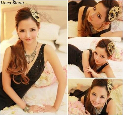 하연수는 가슴라인이 깊이 파인 검은색 드레스를 입고 살짝 올려다 보며 아찔한 분위기를 연출하고 있다.