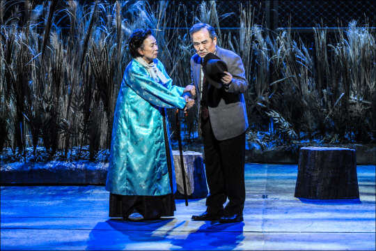 ◇분단의 비극을 견뎌온 한 여인의 삶을 그린 뮤지컬 '서울 1983'. 돌산댁(왼쪽, 나문희 분)이 압록강 국경지대에서 남편(박인환 분)과 재회하는 장면. 사진제공=세종문화회관