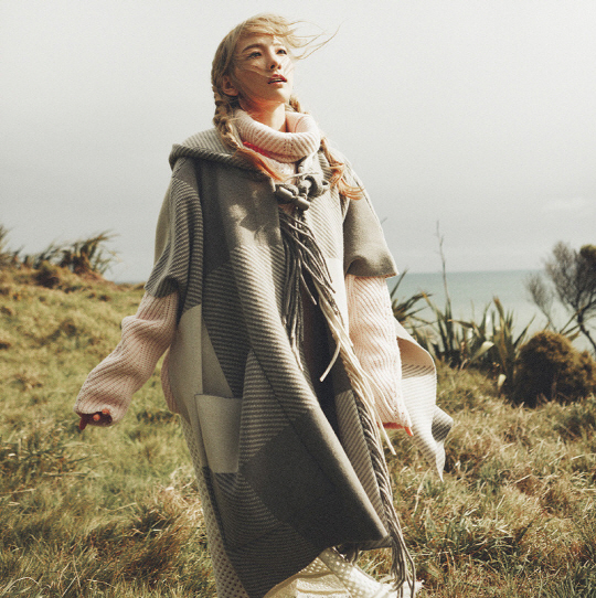따뜻한 감성의 판초 보기만 해도 마음이 평온해지는 판초를 입은 태연의 모습입니다. 파스텔 빛 그레이 앤 화이트의 배색과 마치 담요를 덮은 듯한 포근한 실루엣이 인상적이죠? 이너로는 비슷한 파스텔 컬러감의 핑크 니트를 매치하여 편안하고 따뜻한 느낌을 더욱 살렸습니다. 끌로에의 제품.