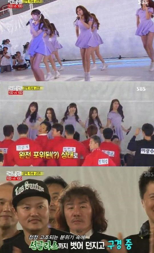 이날 런닝맨 팀과 히어로즈 팀은 60대 60 피구경기가 끝난 뒤 순식간에 '여자친구'의 축하공연이 열렸다.