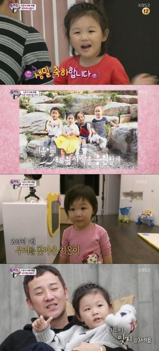 8일 방송된 KBS2 '해피선데이-슈퍼맨이 돌아왔다(이하 슈퍼맨)'에서는 엄태웅 엄지온 부녀의 마지막 인사가 전해졌다. 이날 엄부녀의 반려견인 진돗개 새봄이는 새 생명을 출산했다. 엄지온은 "고생했어. 많이 힘들지"라며 케이크를 먹여줬고 엄태웅 윤혜진 부부는 갓 태어난 강아지들에게 가락이 오돌이 포돌이라는 이름을 지어주며 소소한 출산파티를 열었다.