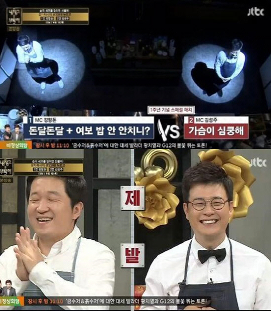 특히 이날 방송말미 1주년을 기념해 MC 김성주와 정형돈의 스폐셜 요리 대결이 펼쳐졌다. 우선 김성주는 요리명 '가슴이 심쿵해'라고 밝히며 "자연주의식 훈제요리를 선보이겠다"라고 각오를 전했다.