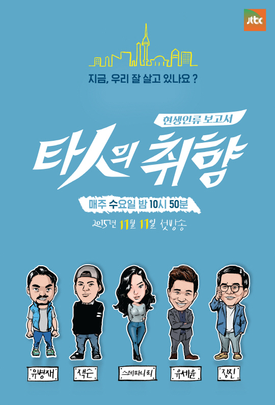 한편, '타인의 취향'은 '본격 취향 저격 예능'을 표방한다. 스타들의 리얼한 일상을 관찰하며 그들의 독특한 취향을 살펴본다. 그동안 공개되지 않았던 스타의 자연스러운 모습과 그들의 취향을 살펴보는 재미, 이를 통해 시청자들이 자신의 취향에 대해 생각해볼 수 있는 시간을 가질 수 있도록 유도하는 새로운 리얼리티 예능 프로그램이다. 란영화 감독 장진, 개그맨 유세윤, 방송작가 유병재, 아이돌 그룹 갓세븐 잭슨, 연기자 스테파니 리가 출연한다.