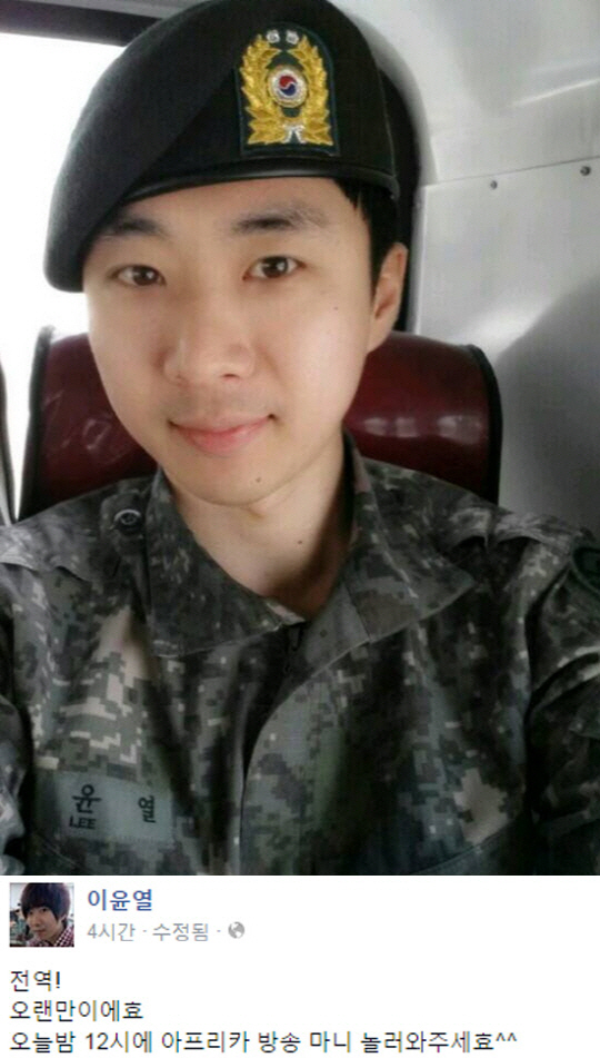 이윤열은 지난 4월 자신의 페이스북을 통해 "전역! 오랜만이에요 오늘밤 12시에 아프리카 방송 많이 놀러와주세요"라는 글과 함께 한 장의 사진을 게재했다.