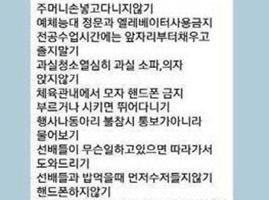 9일 한 인터넷 커뮤니티 게시판에는 수도권의 한 대학교 체육학부 소속 선배들이 후배들에게 명령조로 행동지침을 전달하는 카카오톡 메시지 단체방 대화가 공개됐다.