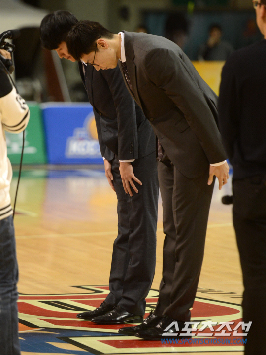 안양 KGC와 전주 KCC의 2015-2016 프로농구 경기가 10일 안양실내체육관에서 열렸다. 불법 스포츠도박으로 물의를 일으킨 KGC 오세근과 전성현이 하프타임때 코트에 나서 팬들에게 사과의 말을 전하고 있다. 안양=허상욱 기자 wook@sportschosun.com/2015.11.10/