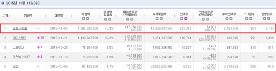이는 금주 개봉작인 '007 스펙터'를 제친 것에다 일반적으로 개봉 후 시간이 지날수록 스코어가 하락하는 것에 반해 '검은 사제들'은 개봉 2주차 평일임에도 불구하고 22만 관객을 동원, 오히려 개봉 첫날(19만 명)보다 3만 명이 늘어난 관객수를 기록했다. 11월 역대 한국영화 최고의 흥행 속도로 각종 기록을 경신 중인 '검은 사제들'은 쟁쟁한 개봉 신작들의 공세에도 불구하고 개봉 2주차 오히려 스코어가 상승하는 이례적인 흥행세를 보이고 있어 앞으로의 흥행 추이에 한층 이목이 집중되고 있다.