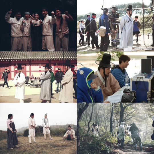 또한 완벽한 남장을 선보인 배수지와 진중한 모습으로 연기에 몰두하는 류승룡, 자신의 연기를 꼼꼼히 살피는 송새벽과 자신의 캐릭터에 몰입한 이동휘, 안재홍까지 추운 날씨에도 홑겹의 한복을 입고 촬영에 임하는 배우들의 다채로운 모습은 이들의 에너지와 열정을 느끼게 하고, 동리정사의 멤버들이 환하게 웃으며 파이팅 하는 모습은 현장의 훈훈한 분위기를 짐작하게 한다.
