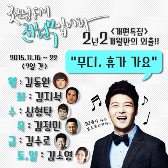 16일 김동완을 시작으로 17일 김지석, 18일 심형탁, 19일 가수 겸 연기자 김정민, 20일 배우 김수로 , 21, 22일 MBC 김소영 아나운서가 DJ 마이크를 잡는다.